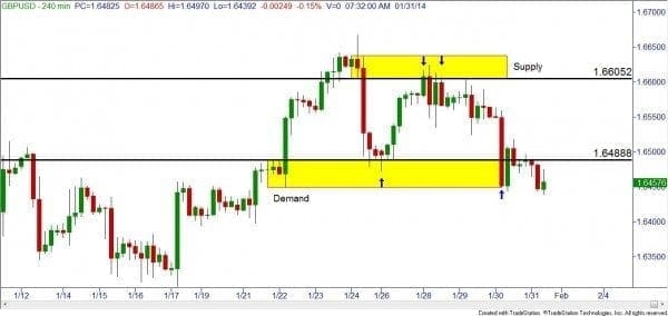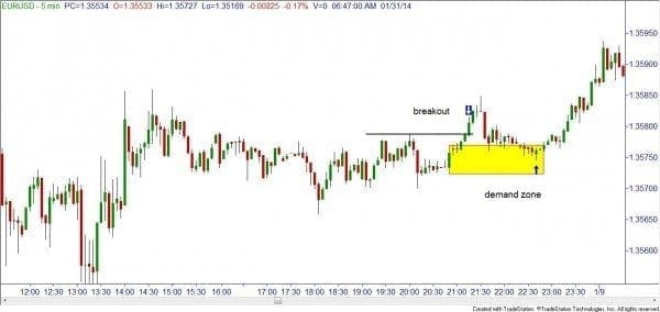 If you are a short term/daytrader, you may be watching a one hour, fifteen minute, and a three minute chart. There are a couple of problems with this style in the spot forex market. The main issue is the de-centralized market we have. What that means is that there isn?t one computer server where all the quotes are reported, and everyone then sees the same charting information. With the spot market, the charts you see are your?broker?s?charts. A one pip breakout on your broker?s charts might not be a breakout anywhere else. This can cause many fake breakouts on your short term charts. In every class, I strongly recommend?against?taking any breakout trades for that main reason. Also, if a currency pair breaks out to the upside, in my opinion the pair has become too expensive to buy.? And on the other side of the coin, a breakout to the downside translates into something that is too cheap for me to sell. I must wait for a pull back to demand to enter a long trade, and a retracement back to supply to enter a short trade. In the following chart, the EURUSD broke out to the upside for a few pips, then quickly retraced back to a small demand zone. My recommended entry is to not buy expensive, but to wait for the retracement to demand, where it is then cheap enough to buy. Yes, you will miss a few trades trading this conservatively, but you will also not take a lot of unnecessary losing trades as many breakout trades don?t work-again, because of the information we get in this de-centralized market.