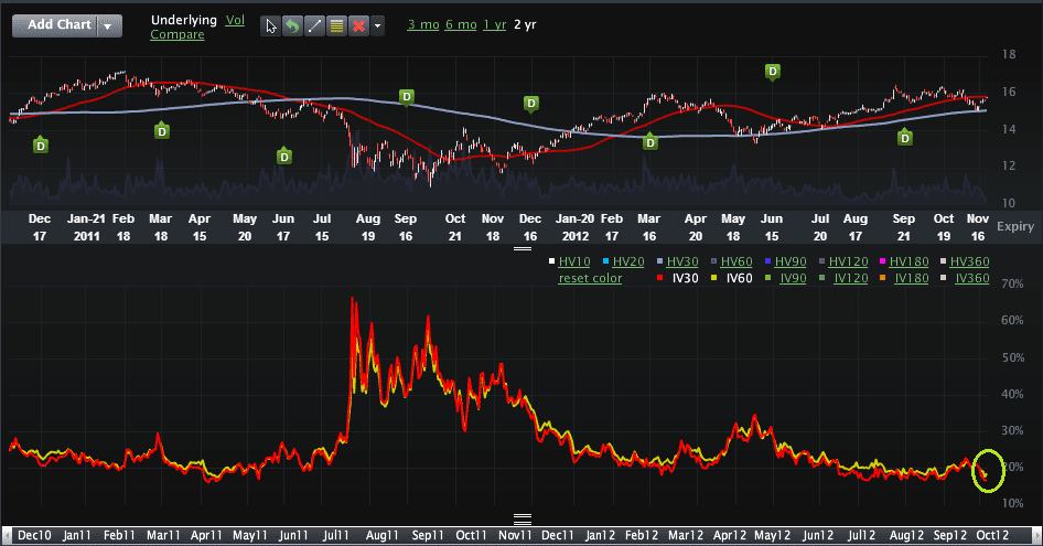 As we head into the fiscal cliff and a potential European solution/crisis one thing strikes me, risk is not being priced into financial assets. ?Yes, the VIX is somewhat low today, trading at 15% or so. ?The VIX futures, though and the VXV are both pricing in a little more volatility after the December cycle. ?We are not seeing the same thing priced into XLF and/or any of the major financial companies. ?Take a look at the price and IV chart for XLF. ?The Red is the 30 day vol; the yellow is the 60 day vol.