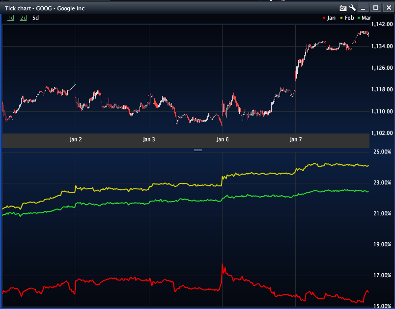 Names like GOOG are putting in big moves.? There was a slug of movers yesterday, and GOOG was not an exception running almost 2% from the closing price yesterday.? The familiar pattern of low pre-earnings volatility kept the GOOG Jan Weekly volatility in the 15% range.? That is less than a 1% move per day on average.?