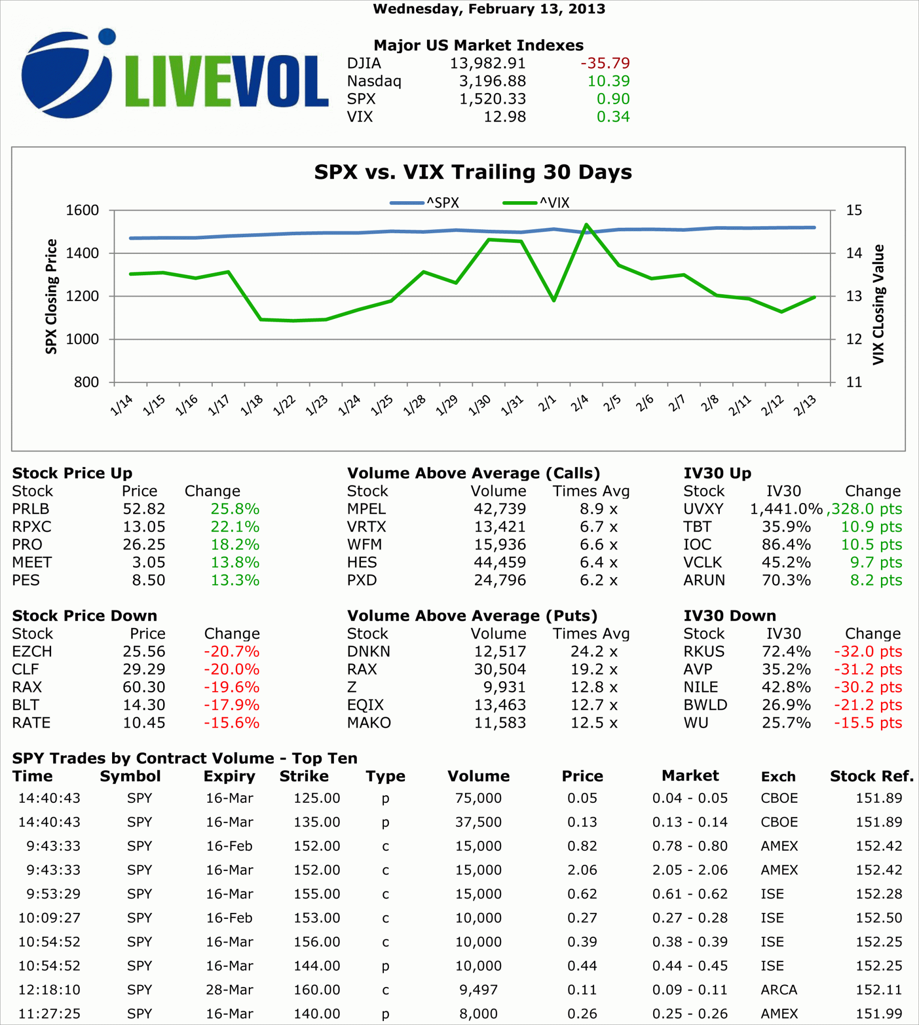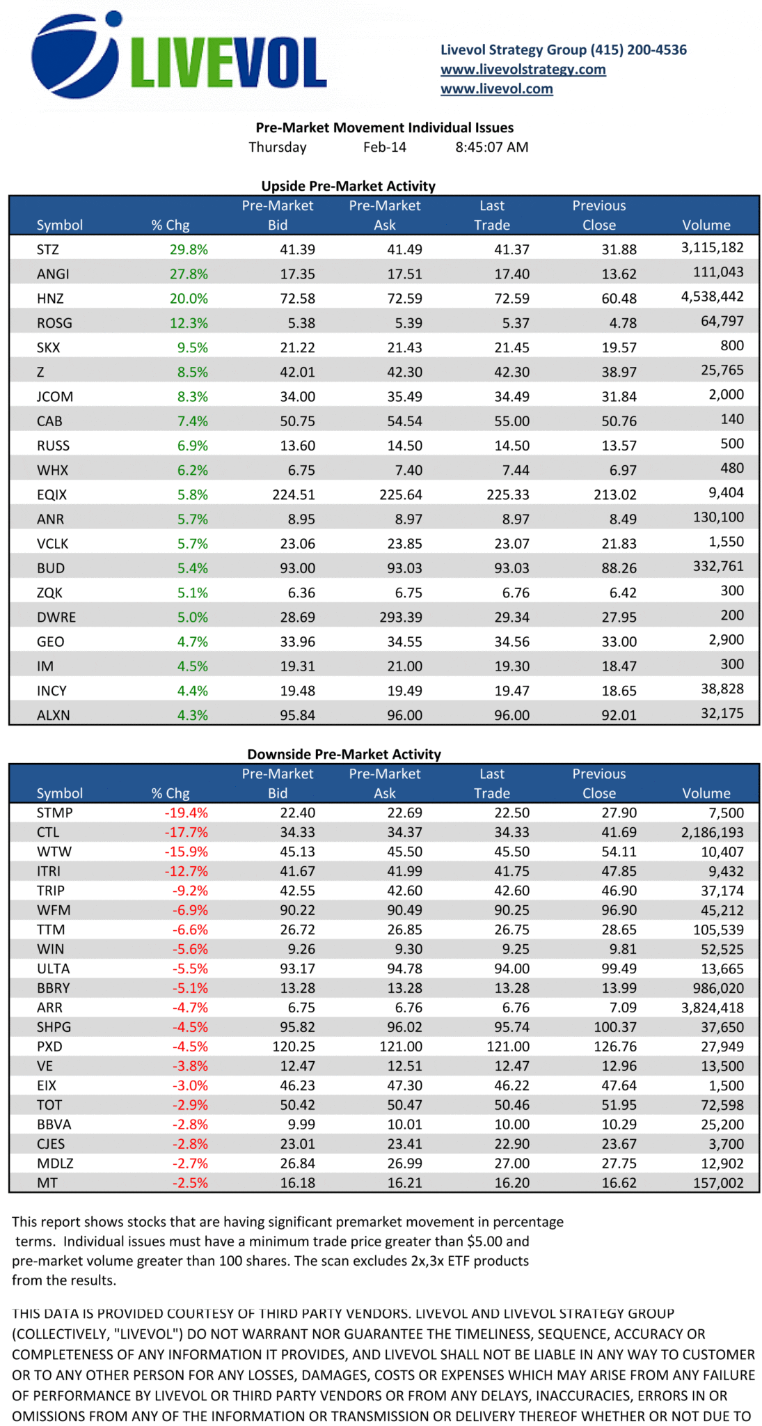 2/14/13 Pre-Market Movers by Ophir Gottlieb | Feb 14, 2013 | Trading & Analysis A quick look at names active in the pre-market for Thursday, February 14
