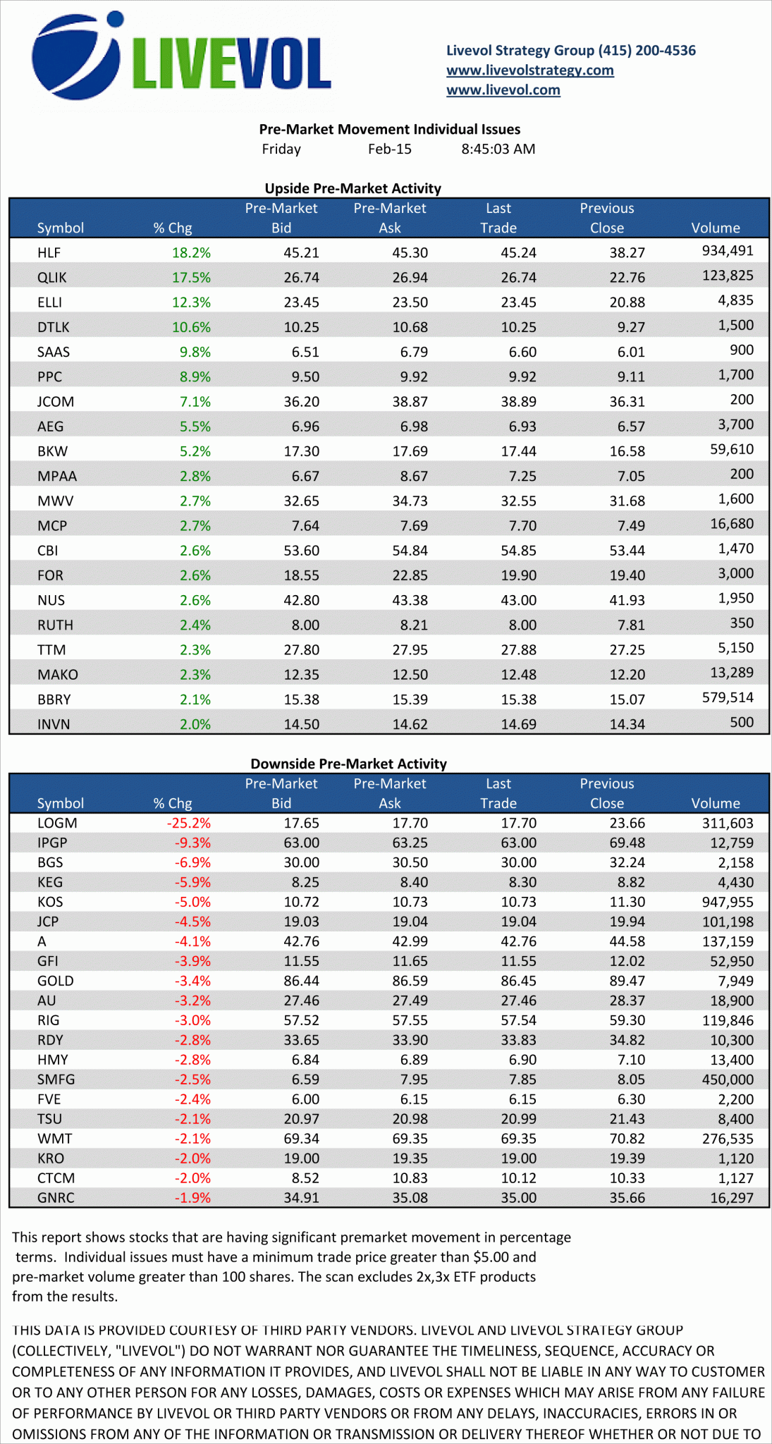 A quick glance at the names active in the pre-market for Friday, February 15