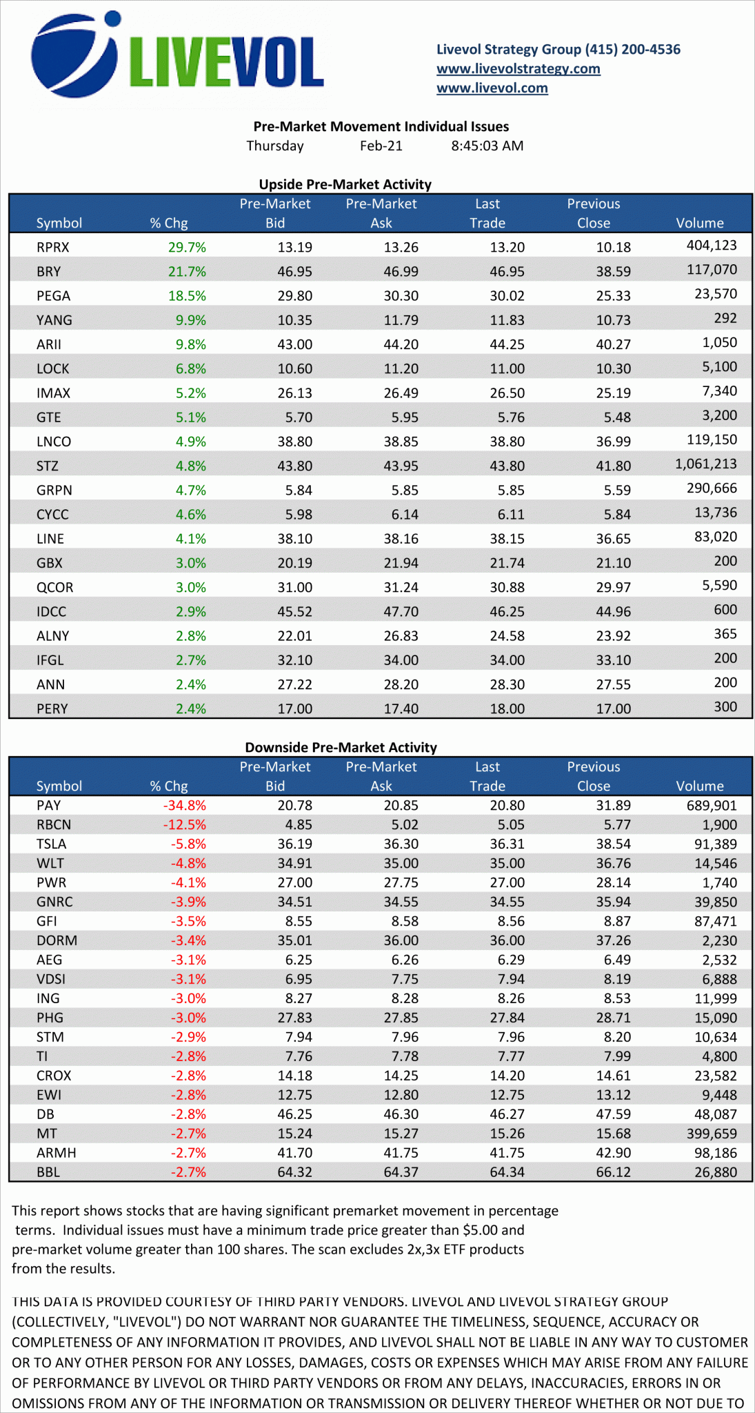 2/21/13 Pre-Market Movers by Ophir Gottlieb | Feb 21, 2013 | Trading & Analysis A quick look at names active in the pre-market for Thursday, February 21
