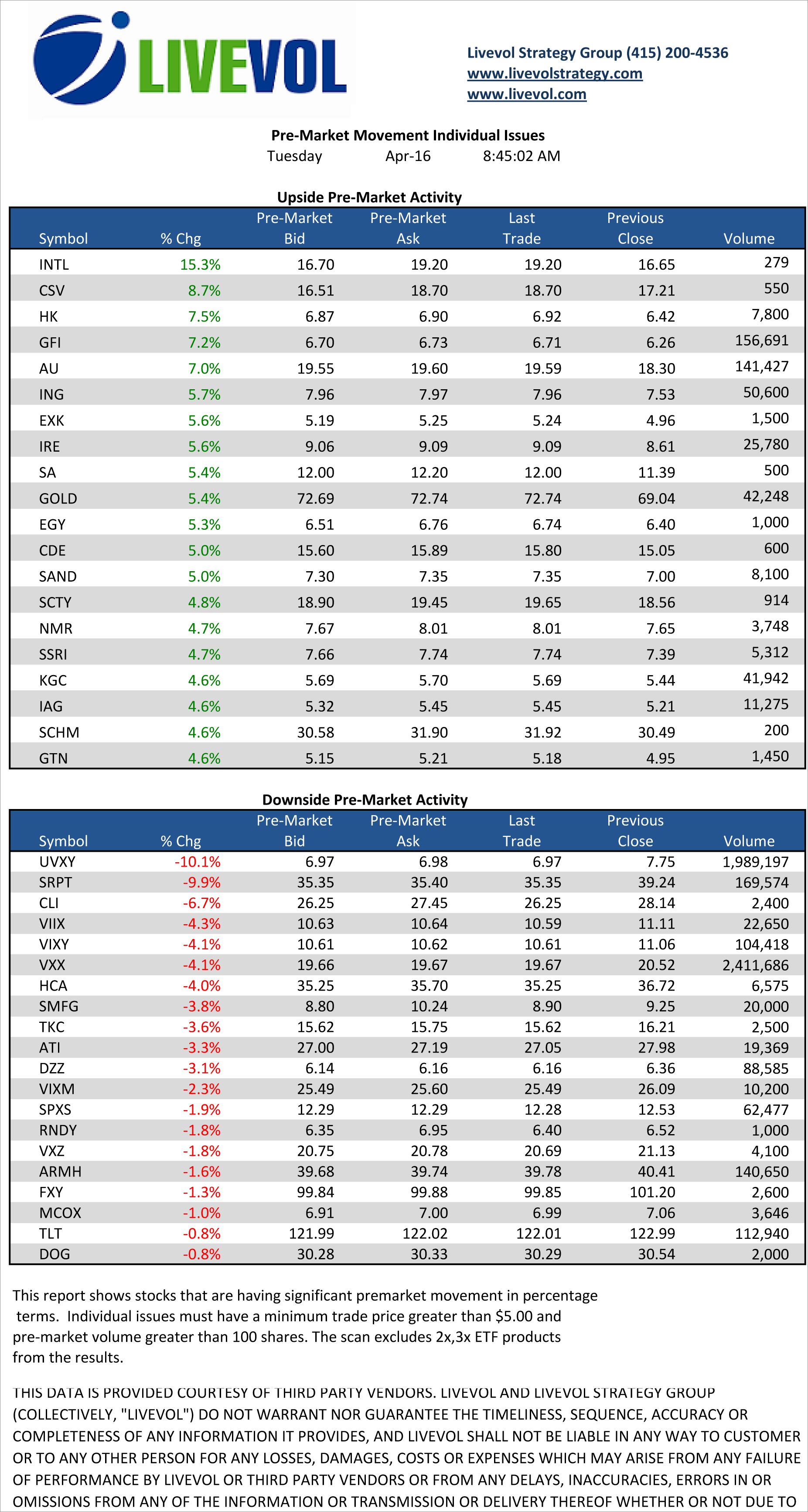 A snapshot of the names active in the pre-market for Tuesday, April 16