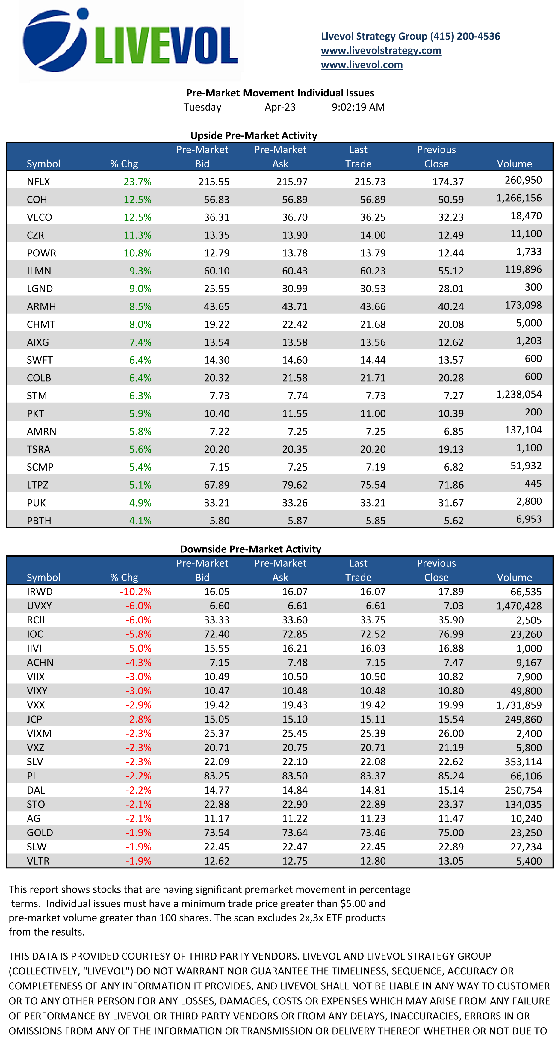 A snapshot of names active in the pre-market for Tuesday, April 23