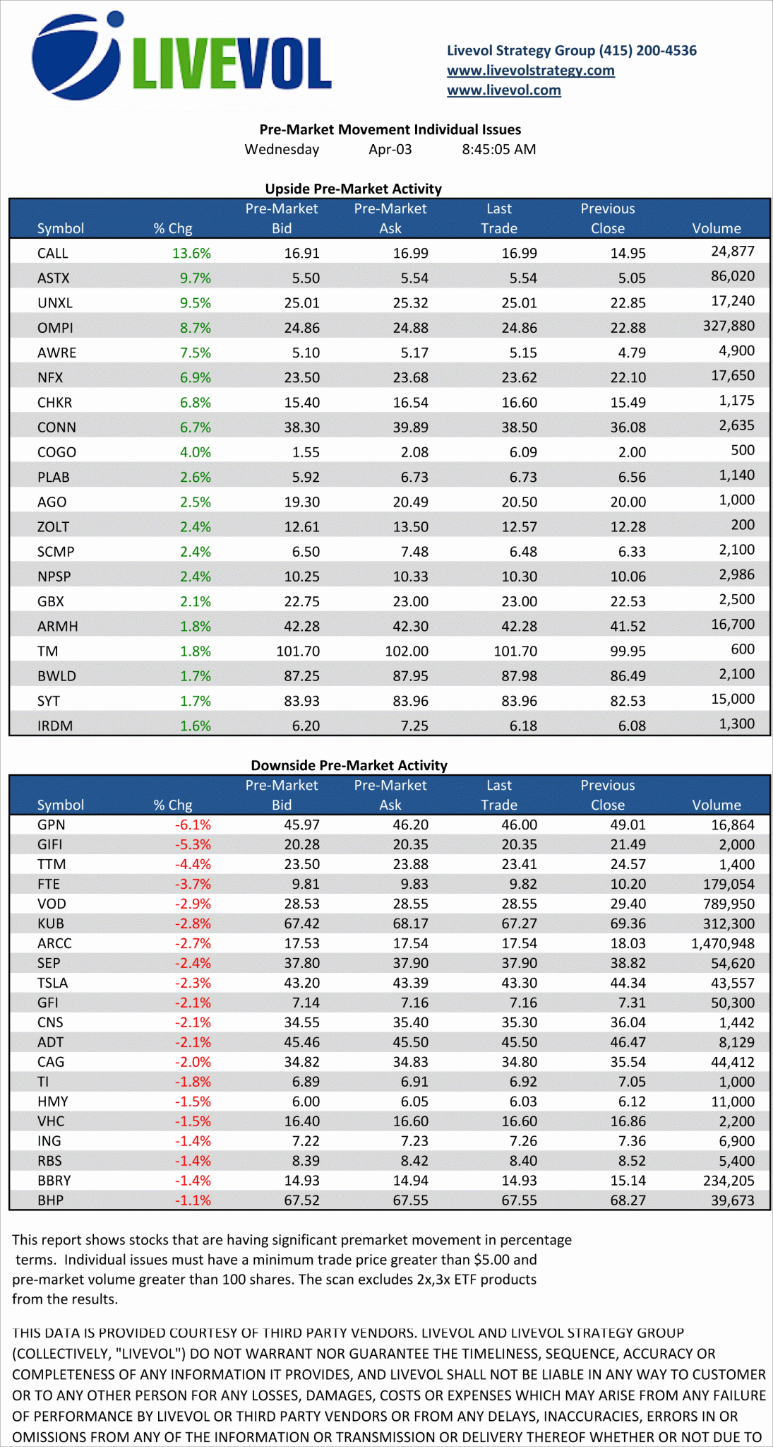 4/3/13 Pre-Market Movers by Ophir Gottlieb | Apr 3, 2013 | Trading & Analysis A quick look at names active in the pre-market for Wednesday, April 3