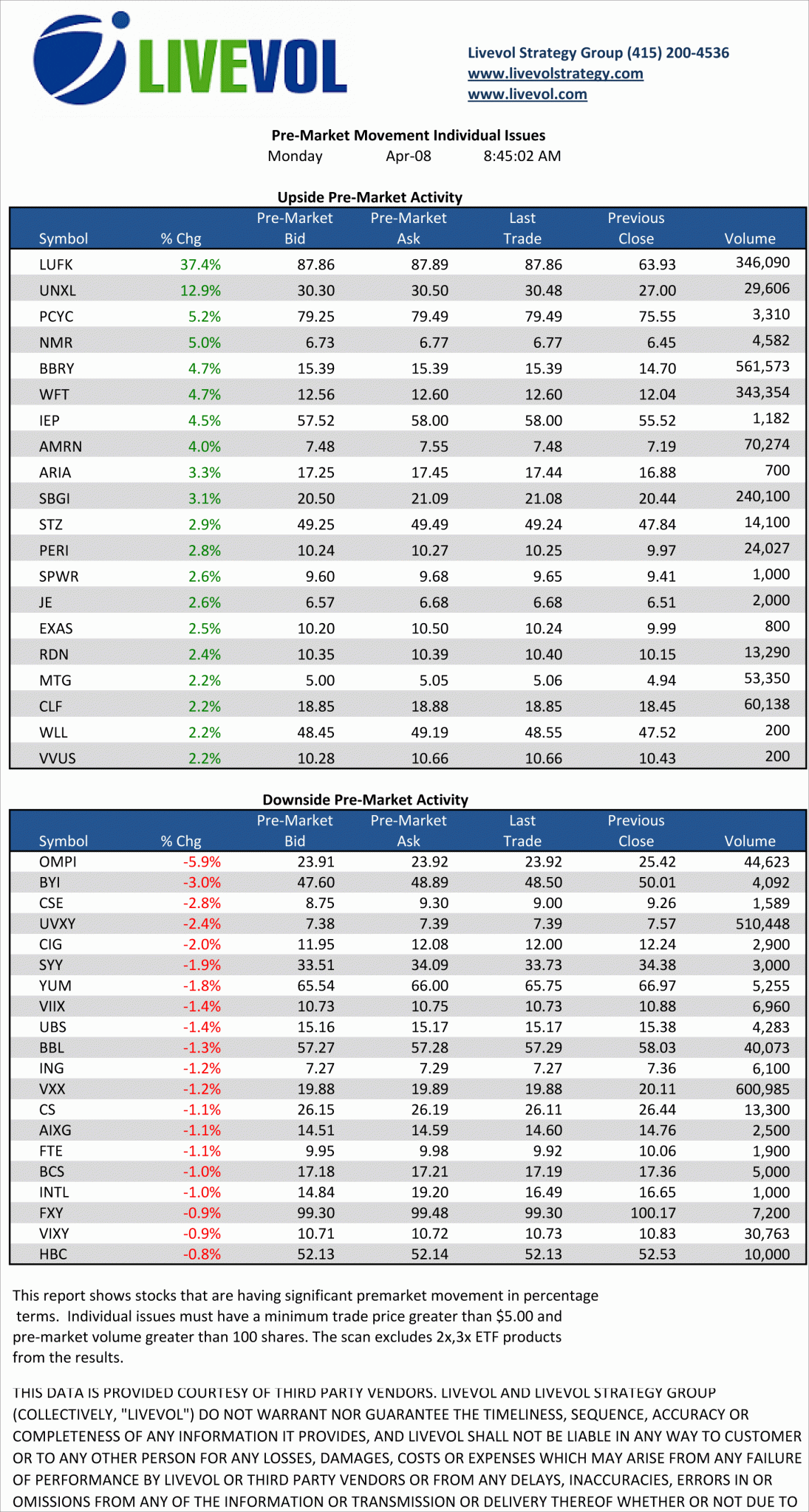 4/8/13 Pre-Market Movers by Ophir Gottlieb | Apr 8, 2013 | Trading & Analysis A quick look at the names active in the pre-market for Monday, April 8.