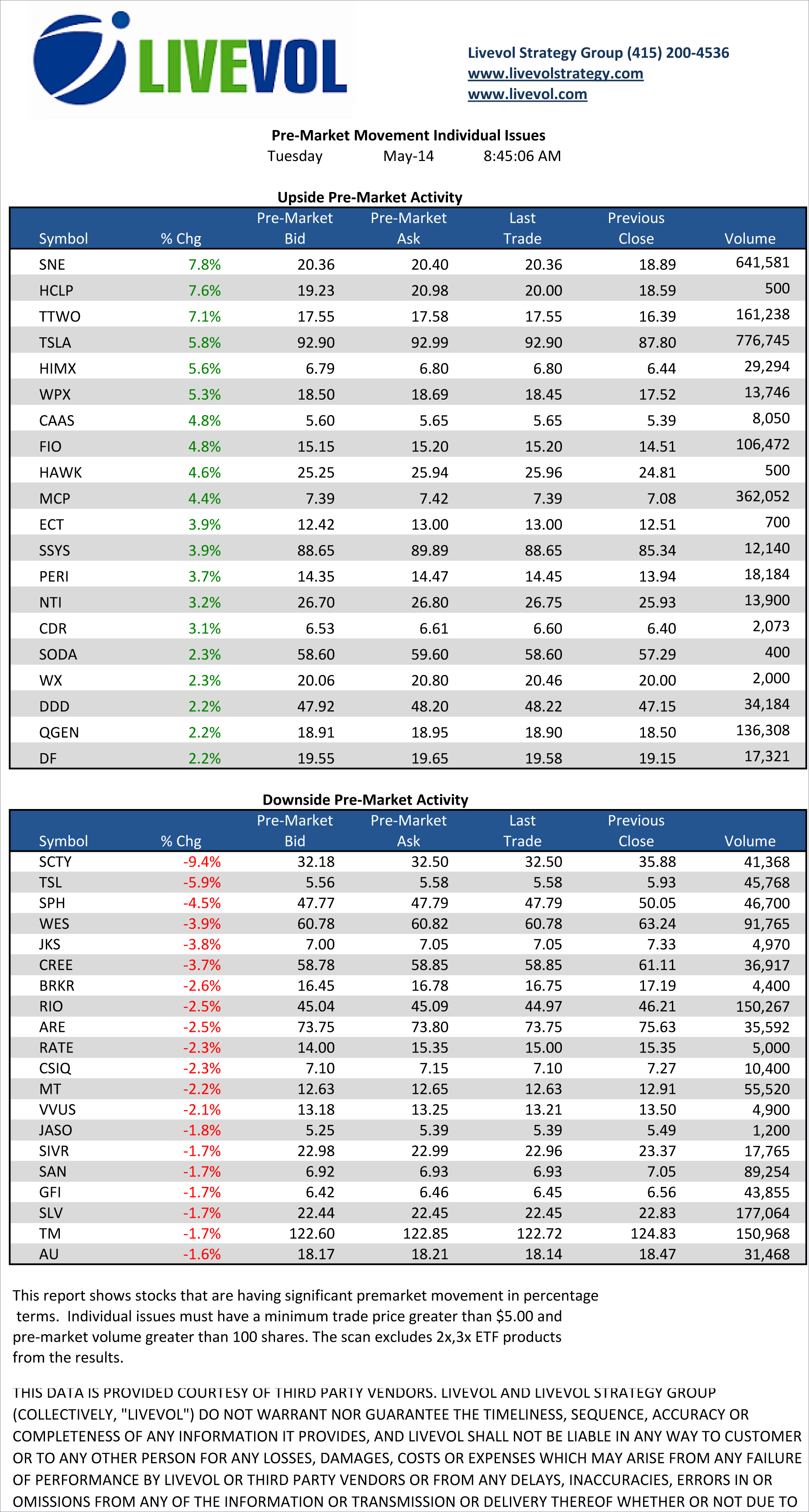 A snapshot of the names active in the pre-market for Tuesday, May 14