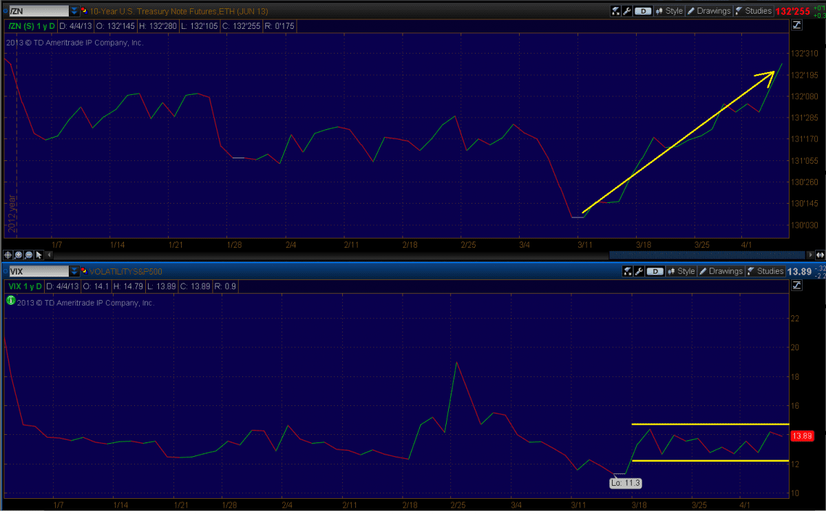 While the VIX has failed to move, another asset has taken off. ?The 10 year note, the original risk asset, has sky rocketed higher as economic figures missed this week. ? I do not think we can attribute this to QE alone, I think this is smart money moving into bonds and out of cash and/or foreign markets.