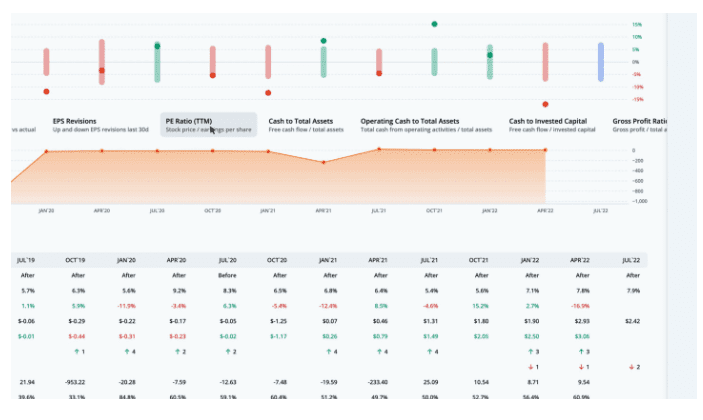 During that time, the post-earnings move was outside of the implied range 5 times. In those cases, long straddles were profitable. The rest of the earnings moves likely yielded profitable short straddles. We can overlay quarterly financial data by clicking on the ratios below the earn move graph. Let’s look at the PE ratio, which is the stock price divided by the trailing twelve months earnings per share.
