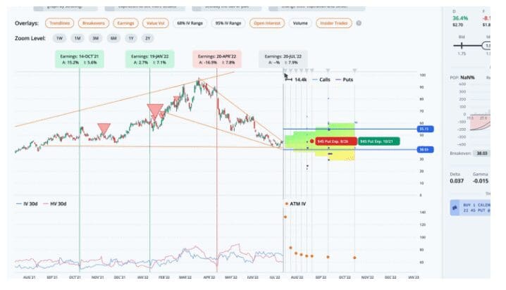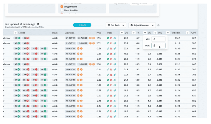 This helps narrow the results to trades that are fairly priced. The highest ranked trade is a Long Put Calendar with strikes at 45, expiring on Friday, October 21st and Friday, August 26th, for a debit of $1.95.