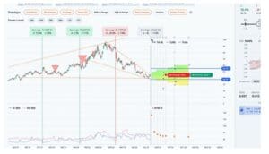 Next, let’s look at this trade in the trade builder. Over the last month, the stock price fell 11.0%, while the thirty-day implied volatility fell 4.2%. The average slope of the trendlines is negative. The heatmap on the right side of the graph is green where volatility and slope are undervalued, and red where they are overvalued. In this case, short term IV and slope are neutral, while the long term is neutral.