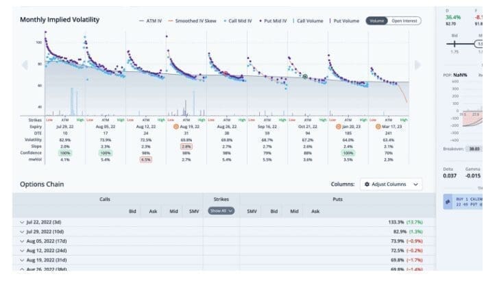 We can also see this trade overlaid on the monthly implied volatility graph in the chain tab. The legs for this trade are circled. For any questions or issues with the article, please contact otto@orats.com. To subscribe to the dashboard, please visit https://orats.com/dashboard.