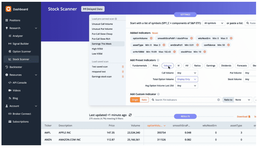 Welcome to the ORATS earnings report where we scan for companies with upcoming earnings announcements, check out historical earnings information, and find a potential options trade.?Read on or watch the video overview here: https://youtu.be/dEO4Dzx_4oE.?Let’s start by running a scan on stocks reporting earnings this week, which includes the total option volume indicator, sorted from greatest to least.