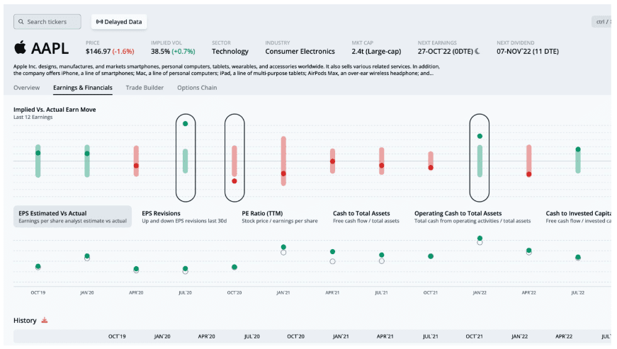 The earnings and financials tab takes us to more detail showing the options market expecting a move of 4.7% in either direction. This move was breached in 3 out of the last 12 earnings.