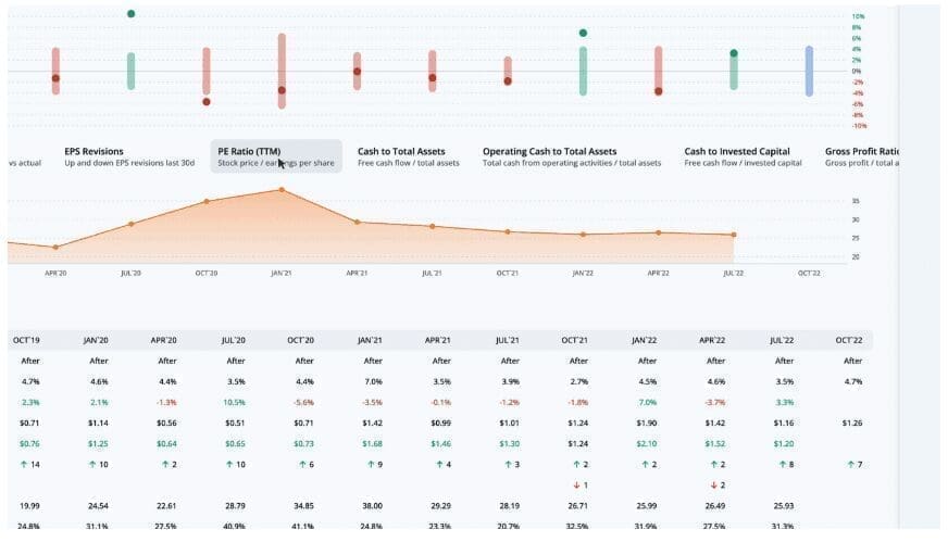 During that time, the post-earnings move was outside of the implied range 3 times. In those cases, long straddles were profitable. The rest of the earnings moves likely yielded profitable short straddles. We can overlay quarterly financial data by clicking on the ratios below the earn move graph. Let’s look at the PE ratio, which is the stock price divided by the trailing twelve months earnings per share.