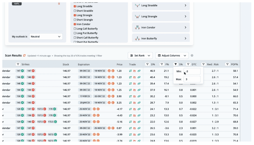 For AAPL, the current PE ratio is 24.3, which is 12.2% under the average for the last twelve earnings observations. Returning to the overview tab, we can quickly run a scan to find the best option trades. Since earnings are right around the corner, we scan for neutral strategies, then filter the scan results by S%, or smoothed edge, by setting it between negative and positive 3%.