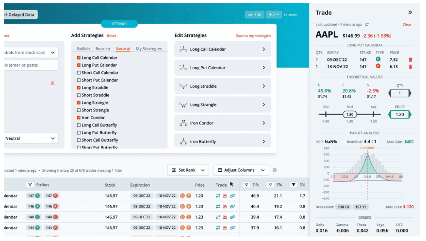 This helps narrow the results to trades that are fairly priced. The highest ranked trade is a Long Put Calendar with strikes at 147, expiring on Friday, December 9th and Friday, November 18th, for a debit of $1.2.