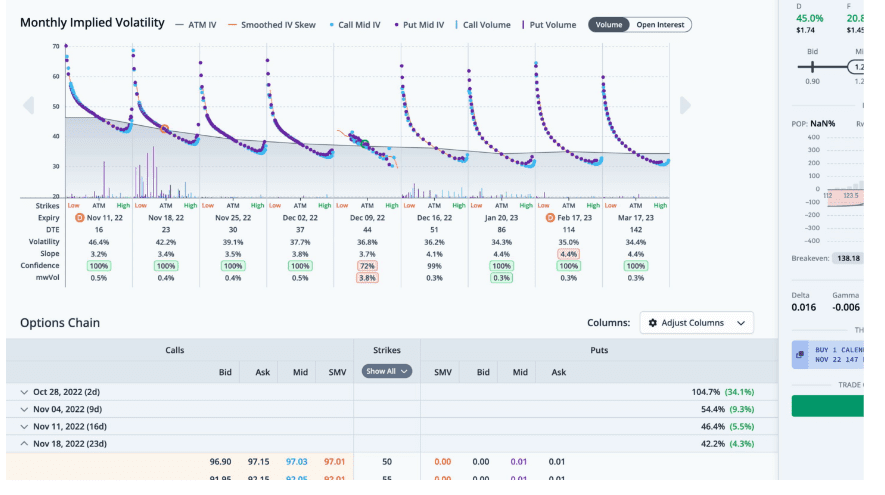We can also see this trade overlaid on the monthly implied volatility graph in the chain tab. The legs for this trade are circled. For any questions or issues with the article, please contact otto@orats.com. To subscribe to the dashboard, please visit https://orats.com/dashboard.
