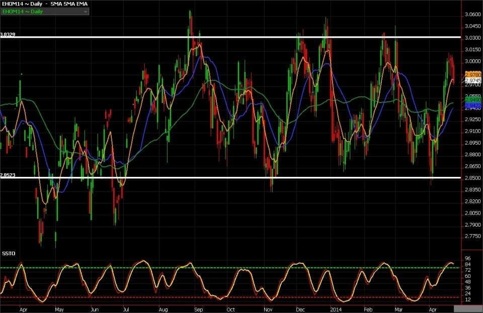 See chart 1 below for June heating oil futures over the last?12 months. I drew a a support and?resistance?line in white?and one can see that for the most part futures have been in a 15-18 cent?trading?range. On a 42,000 gallon contract this?represents?a trading range of $6,300 to $7,560. Stochastics are overbought and futures appear to be starting to roll over. I see red in the last four sessions and prices are probing the 8 day MA ( orange line) ?as of this post.