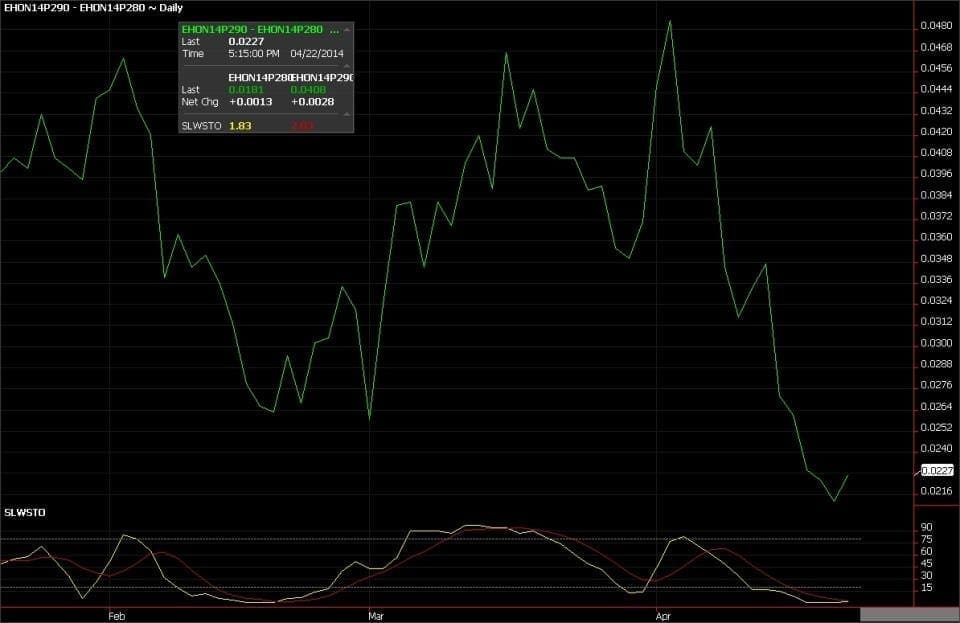 The second chart is an?options?play that I like buying July $2.90 / 2.80 bear put?spreads. 63 days until expiration. Current pricing has July futures at $2.9775. Current delta on?this?strategy is 15%. 227 points on the spread represents a cost of 227 x $4.20 or $953.40. To talk about specific risk and exits strategies please contact me. This is NOT a buy and fall asleep at the wheel trade.