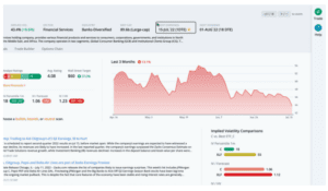 The earnings and financials tab takes us to more detail showing the options market expecting a move of 4.4% in either direction. This move was breached in 2 out of the last 12 earnings.