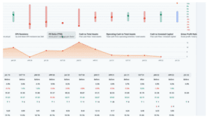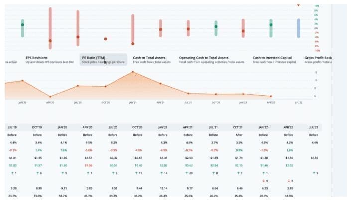 During that time, the post-earnings move was outside of the implied range 1 times. In those cases, long straddles were profitable. The rest of the earnings moves likely yielded profitable short straddles. We can overlay quarterly financial data by clicking on the ratios below the earn move graph. Let’s look at the PE ratio, which is the stock price divided by the trailing twelve months earnings per share.