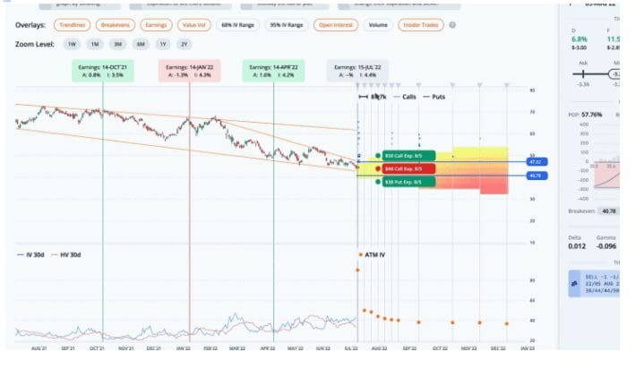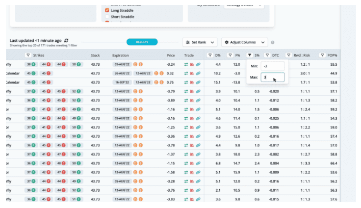 This helps narrow the results to trades that are fairly priced. The highest ranked trade is a Iron Butterfly with strikes at 38, 44, and 50, expiring on 2022-08-05, for a credit of $3.24.