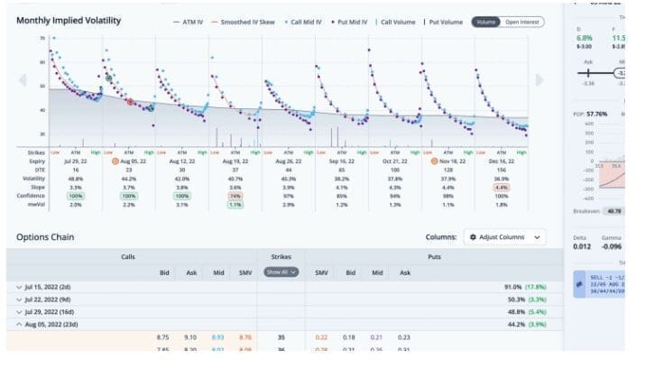 We can also see this trade overlaid on the monthly implied volatility graph in the chain tab. The legs for this trade are circled. For any questions or issues with the article, please contact otto@orats.com. To subscribe to the dashboard, please visit https://orats.com/dashboard.