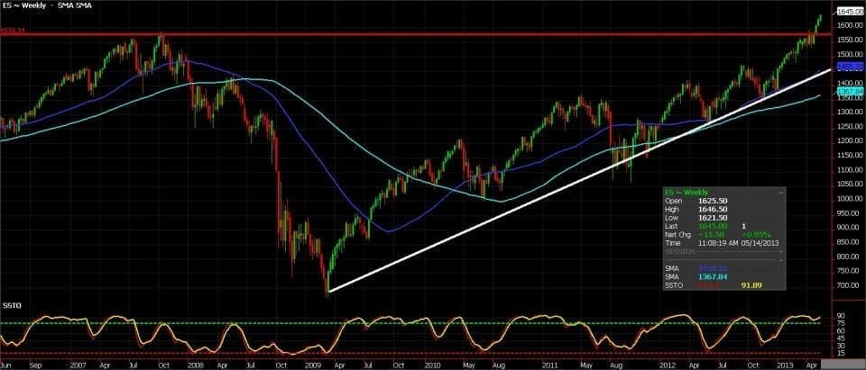 Hindsight being 20-20 stock investors that timed the market buying after the 07-08 drop or even having stayed the course are currently being rewarded. The S&P is trading at fresh record highs having appreciated nearly 150% off the ?666? lows made in March 09?. Let?s examine the movement?Futures peaked in October 07? just shy of 1600 only to decline 58%. It took just over 30 months for equities to get back to levels reached in 07? and in the last 3 months record high territory. As one can see we?ve danced the trend line in years past (white line). ?I am incapable of picking a top but I am very leery…when getting a haircut last week two barbers were talking about their stock holdings and how they are doing so well in recent months and offering trading tips. To put in perspective they are likely trading very few share but buyer beware. I believe a 10% correction will eventually happen?in full disclosure I have been voicing this for several weeks. At a minimum my advice for clients holding a sizable stock portfolio is to take some money off the table. A move back to the trend line represents a correction of 11.5%.