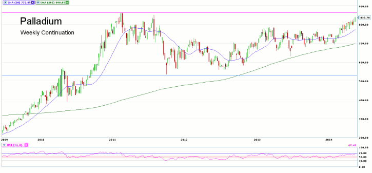 Palladium continues to be the best performing of the major precious metals, with prices approaching highs not seen since 2011, as traders fear that supplies are not keeping up with demand.? Violence has erupted in South Africa, where precious metals miners have been on strike for over 4 months. This has curtailed Palladium supplies out of one of the world?s largest producing nations, responsible for about one-third of the global Palladium production. A report by Johnson Matthey suggests the Palladium market may see a deficit of over 1.6 million ounces in 2014, vs. just over 370,000 ounces in 2013. The wild-card for the Palladium market will be Russia, which is the largest global producer of Palladium. In 2013, Russia was responsible for just over 40% of global Palladium supplies, and it appears that sales from state-owned reserves may cease this year, as domestic inventories have fallen to near zero. The possibility of additional western nation sanctions against Russia for its involvement in Ukraine may also limit supplies of Palladium to the market this year. ?