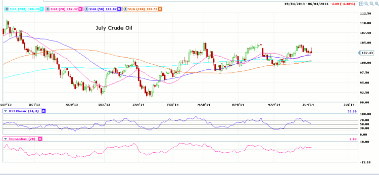 Turning to the chart, we see the July Crude Oil contract in range-bound trading between 97.50 and 105.? The chart pattern and oscillators hint at further sideways trading.? The price channel has narrowed a bit, but not enough to suggest that a breakout is imminent.? The RSI closed the session almost exactly on the 50 line.