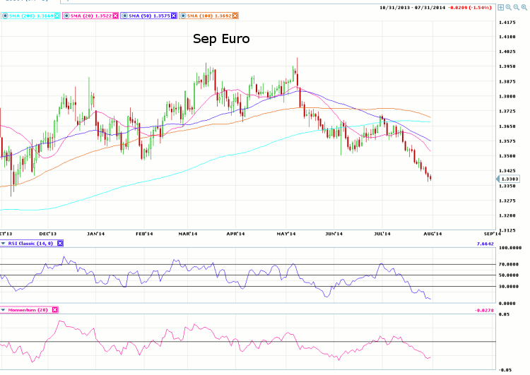 The inflation conversation in the US has had a very different tone, with the Fed hinting toward tightening to keep inflation in check.? The Fed has recently cut its asset purchases to $25 billion a month, staying on track for the central bank?s October target to end the program. Currency traders are also down on the Euro in light of economic progress in the US.? Traders are looking for tomorrow?s non-farm payroll data to show the US private sector added 231,000 jobs in July, and for unemployment to stay at 6.1%.? ?
