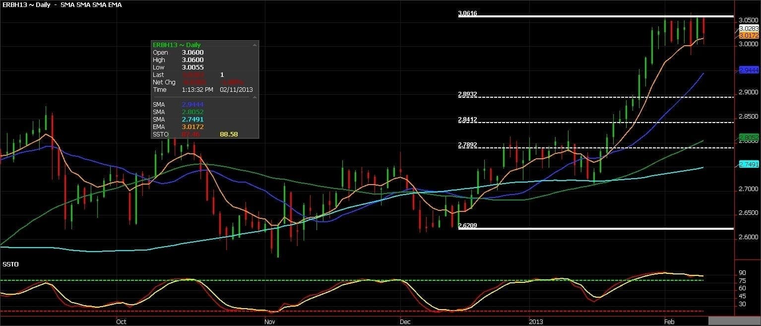In the last three weeks, RBOB futures have appreciated 30 cents or 11% putting prices over $3/gallon.? It appears that we are running into resistance at $3.05 on the March contract and I see limited upside before we have at least a moderate correction. Support is seen on the chart above at the 8 day MA; identified by the orange line. I think we need to see consecutive settlements under that pivot point before futures retrace. As one can see on the stochastic under the chart prices are extremely over bought. I have suggested traders have bearish trades on their radar but have yet to make any moves as I am looking for confirmation.