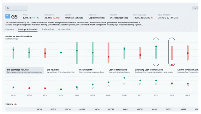 The earnings and financials tab takes us to more detail showing the options market expecting a move of 3.5% in either direction. This move was breached in 2 out of the last 12 earnings.