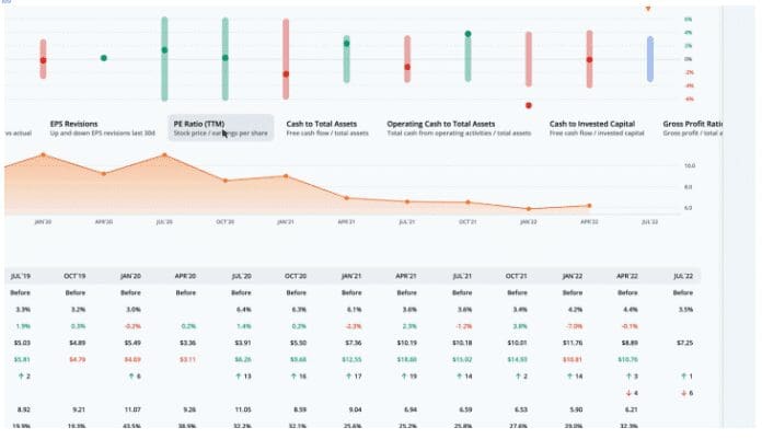 During that time, the post-earnings move was outside of the implied range 2 times. In those cases, long straddles were profitable. The rest of the earnings moves likely yielded profitable short straddles. We can overlay quarterly financial data by clicking on the ratios below the earn move graph. Let’s look at the PE ratio, which is the stock price divided by the trailing twelve months earnings per share.