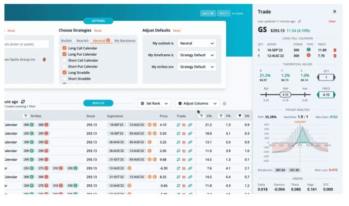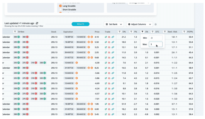 This helps narrow the results to trades that are fairly priced. The highest ranked trade is a Long Call Calendar with strikes at 300, expiring on Friday, September 16th and Friday, August 12th, for a debit of $4.1.