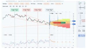 Next, let’s look at this trade in the trade builder. Over the last month, the stock price rose 2.9%, while the thirty-day implied volatility fell 14.2%. The average slope of the trendlines is negative. The heatmap on the right side of the graph is green where volatility and slope are undervalued, and red where they are overvalued. In this case, short term IV and slope are neutral, while the long term is very overvalued.