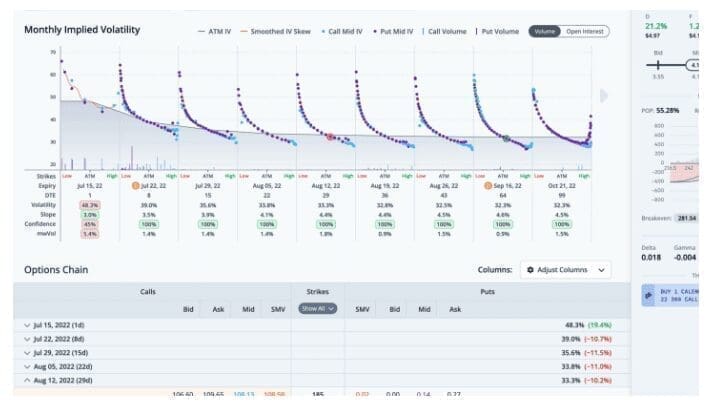 We can also see this trade overlaid on the monthly implied volatility graph in the chain tab. The legs for this trade are circled. For any questions or issues with the article, please contact otto@orats.com. To subscribe to the dashboard, please visit https://orats.com/dashboard.
