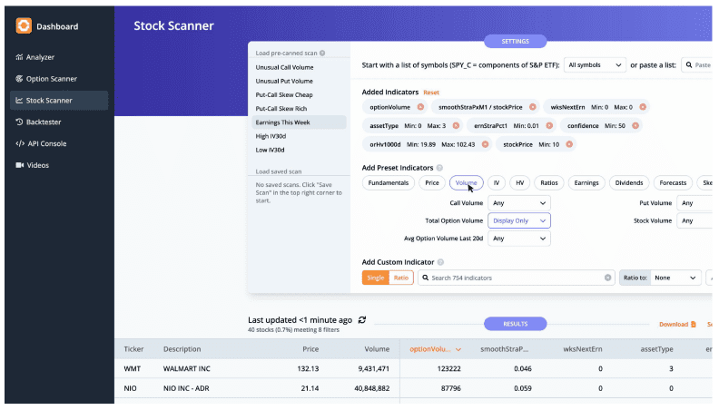 Welcome to the ORATS earnings report where we scan for companies with upcoming earnings announcements, check out historical earnings information, and find a potential options trade.?Read on or watch the video overview here: https://youtu.be/FnZnkvATORg.?Let’s start by running a scan on stocks reporting earnings this week, which includes the total option volume indicator, sorted from greatest to least.