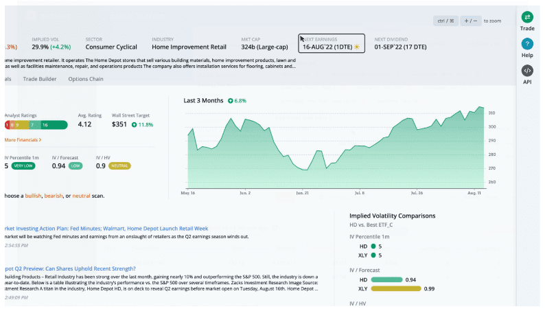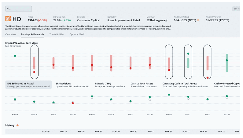 Focusing on Home Depot, as we click through, we see this large-cap company in the home improvement retail industry reports earnings on Tuesday, August 16th, before the open.