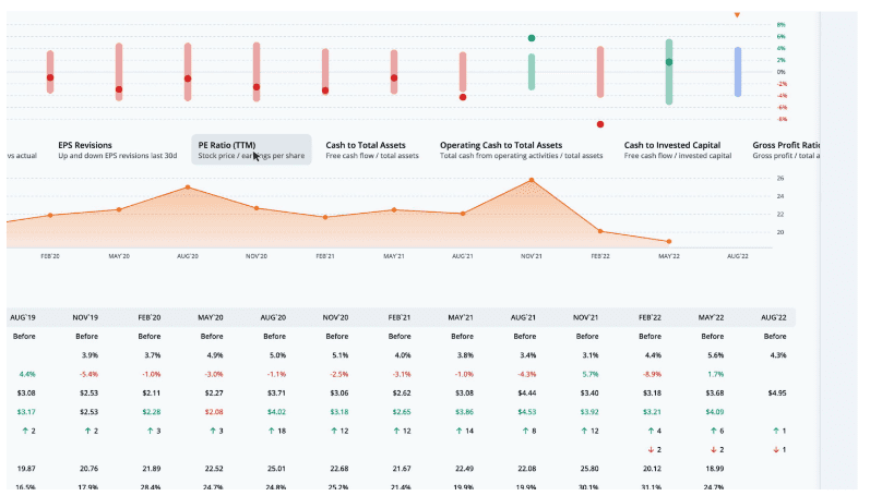 During that time, the post-earnings move was outside of the implied range 4 times. In those cases, long straddles were profitable. The rest of the earnings moves likely yielded profitable short straddles. We can overlay quarterly financial data by clicking on the ratios below the earn move graph. Let’s look at the PE ratio, which is the stock price divided by the trailing twelve months earnings per share.