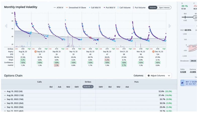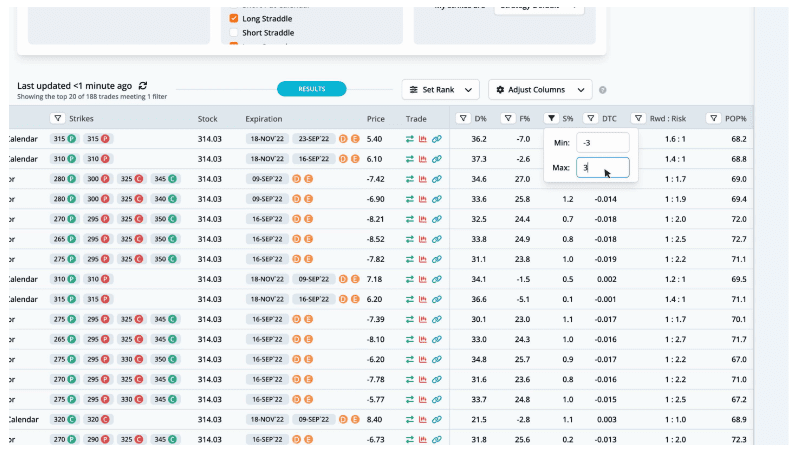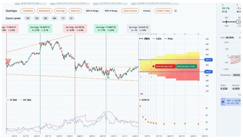 This helps narrow the results to trades that are fairly priced. The highest ranked trade is a Long Put Calendar with strikes at 315, expiring on Friday, November 18th and Friday, September 23rd, for a debit of $5.4.