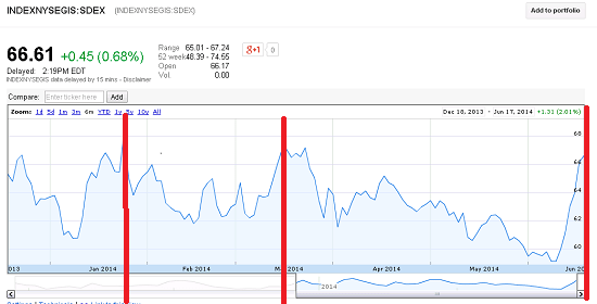 Note the SDEX index, which is the 25 delta put IV to the atm put IV in the 30 day options in the SPX. ?The higher the SDEX the steeper the skew. ?There might not be a bid for the ATM options but there sure is for the OTM puts. ?Note that the last two times SDEX jumped over 66 stocks sold off, once bigger and once a little less.