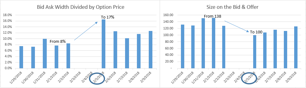 1. The ask-bid / option price went from 8.2% average for the week before to 16.6% on 2/5 (more than doubled!).