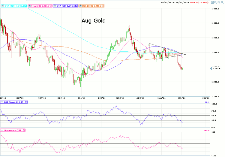 Turning to the continuation chart, we see the August Gold contract breaking out of a wedge formation to the downside.? The August contract is trading near minor support around the 1235 mark.? If Gold prices are unable to hold the level, traders may wish to keep an eye on the 1200 level.? Not only is this chart support, but failure to hold the 1200 mark could be a psychological setback for metal bulls.? Due to recent negative price action, the RSI indicator is showing oversold levels, which could be seen as slightly positive in the near-term.?