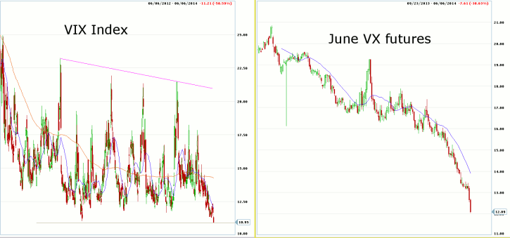Looking at the daily chart for the CBOE Volatility Index (VIX) and the June VX futures, we notice the index hovering at the low end of the recent trading range and approaching lows not seen since March 2013. The June futures have fallen sharply the past two trading sessions, as the front-month futures start to lose some of their premium to the cash index as we approach expiration. Support for the Jun VX is seen at 10.50, with resistance found at 13.10.?