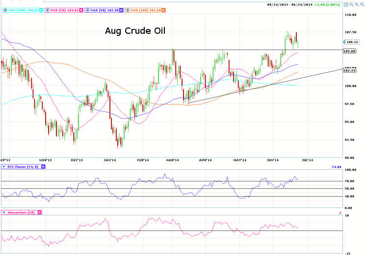 Crude Oil futures continue to trade north of the $105 level, underpinned by the Iraqi forces clashing with ISIS rebels. Iraqi military forces have taken control of the Baiji refinery back from Islamist rebels. The likelihood of supplies from the nation being disrupted is very low at the moment. Nevertheless, fear has been a major driving force behind prices. If the Iraqi army is able to suppress the ISIS rebels, we could see a good chunk of this fear premium dissipate. ?