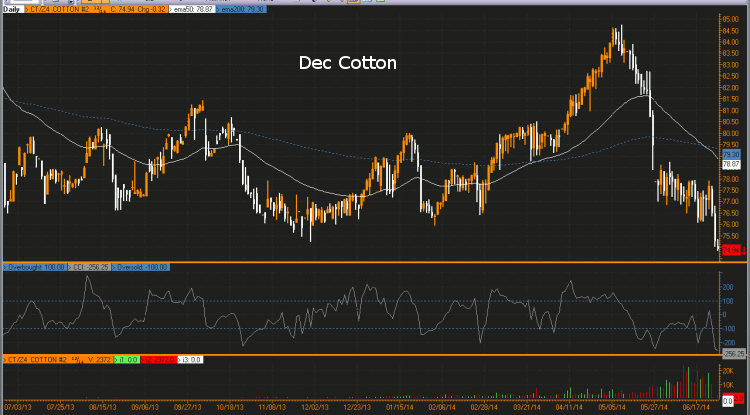 Cotton futures continue their slide due to favorable growing conditions and the July roll ahead of first notice day. ICE inventories of Cotton have risen to 439,198 from 436,979, indicating weak delivery demand. Increased plantings and soft demand strongly suggest that stockpiles of Cotton thread are slated to increase this year. Technically, the December futures have fallen by over 20%, signifying a technical bear market. This could trigger further technical liquidation.