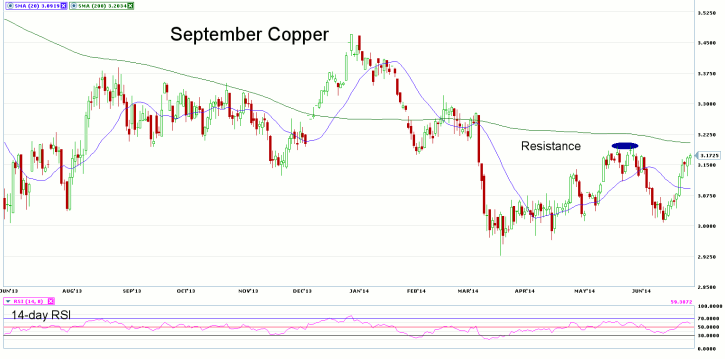 Looking at the daily continuation chart for Copper futures, we notice the market restoring nearly all of its recent losses that were tied to concerns of a Chinese government investigation into bank lending practices that may have involved the pledge of commodities, including Copper that may not exist. Prices are now back above the 20-day moving average (MA) but are still hovering just below the widely watched 200-day MA, which many trades view as the determinant as to whether a market is in a bull or bear market state. The 14-day RSI is strong, with a current reading of 63.94. The next resistance level is seen at 3.1780, with support found at 3.0100.?