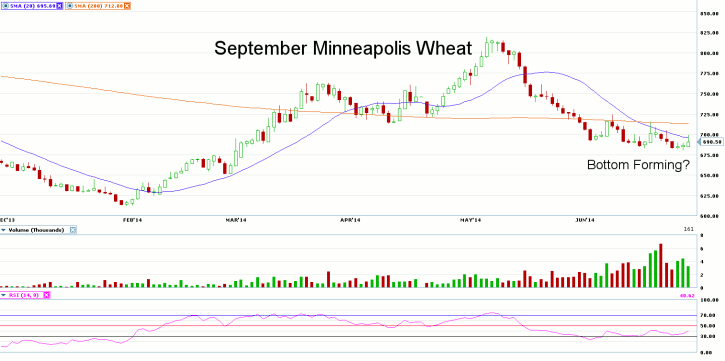 Looking at the daily chart for September Minneapolis Wheat (MWU14), we notice what looks like a potential bottoming formation as prices appear to be putting in a floor just above 680.00. In addition, we are starting to see what may be a bullish divergence in the 14-day RSI as this momentum indicator has formed a bottom prior to the recent lows made in the futures.? 680.50 is seen as support for the September contract, with resistance found at the June 9th high of 724.25.